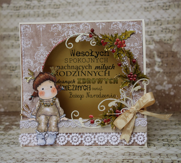 W dzisiejszej kartce przez okienko zaglądają życzenia nadrukowany na złoty papier. Oszronione transparentnym brokatem są też zawijaski, a złotym różki Tildy. Ostrokrzew nadrukowany jest na tym samym złotym papierze co życzenia, podkolorowany Copicami.
