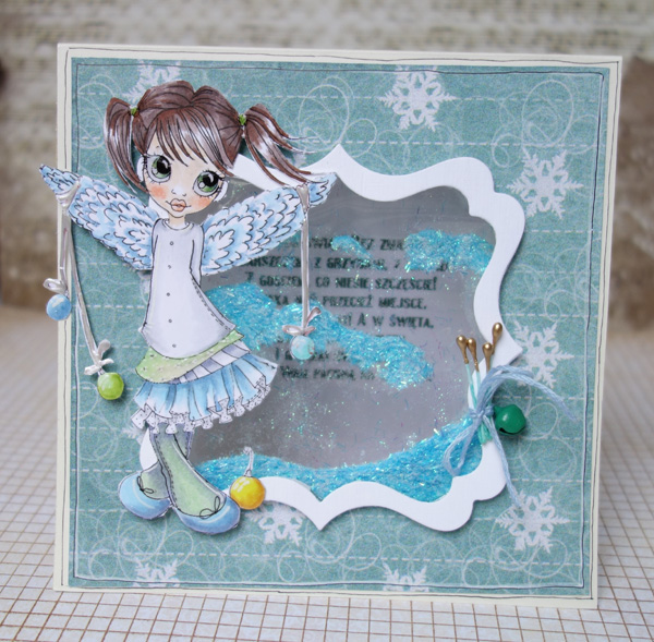Kolejna to otwierana karteczka z okienkiem. Poleci gdzieś, gdzie są dzieci. Nie dość że w okienku przesypuje się brokat, to podczas trzęsienia kartką brzęczy mały, zielony dzwoneczek przyczepiony do ramki.